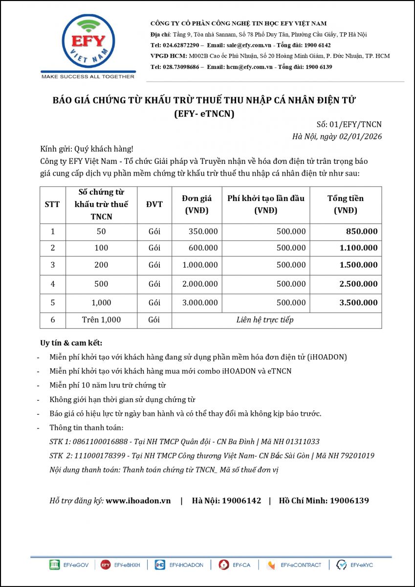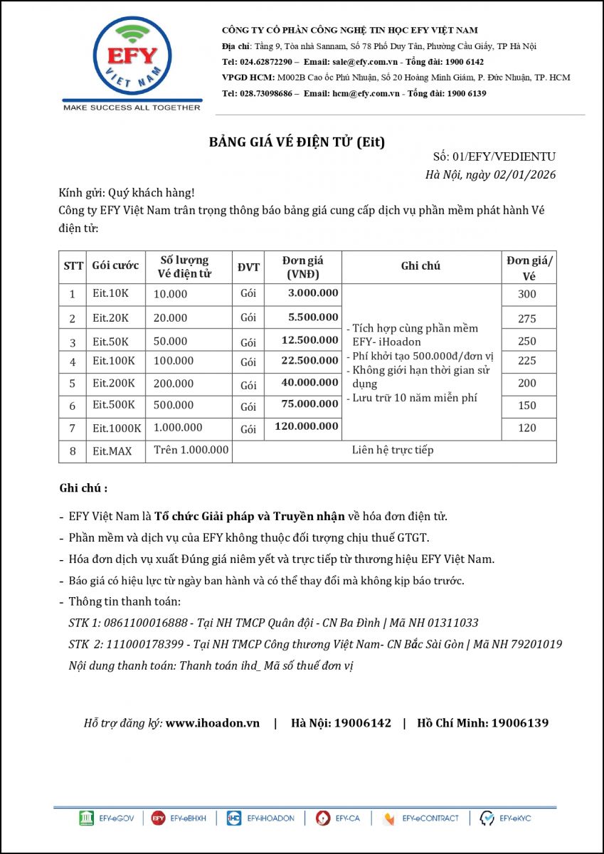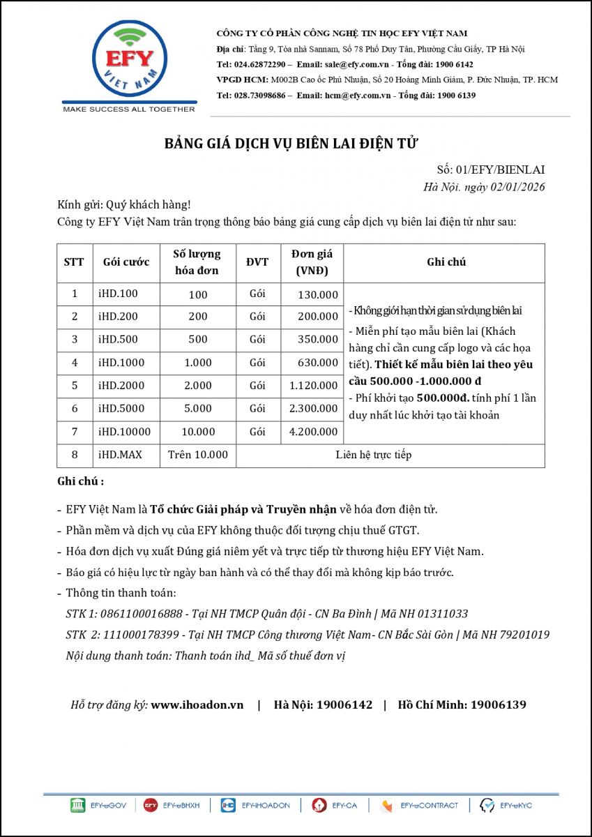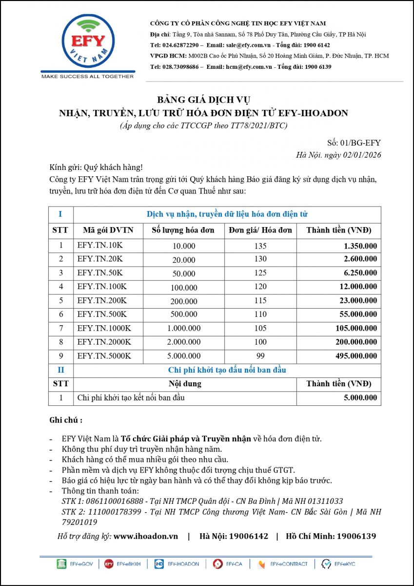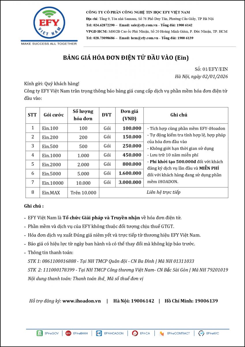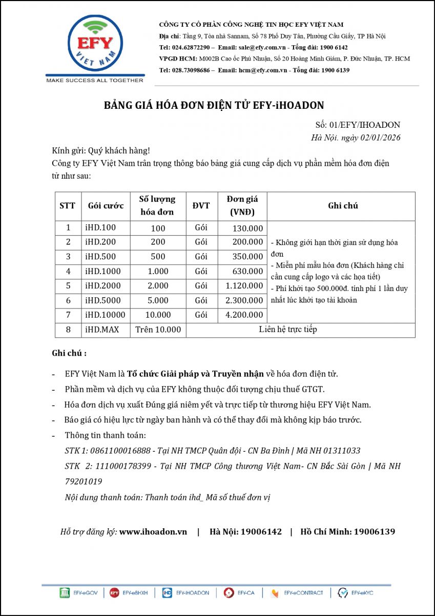EFY Việt Nam xin gửi lời chào trân trọng và cảm ơn tới Quý Khách hàng đã quan tâm đến sản phẩm, dịch vụ của chúng tôi. Chúng tôi xin gửi tới Quý Khách Bảng báo giá Hóa đơn điện tử có hiệu lực kể từ ngày 02/01/2026 như sau: