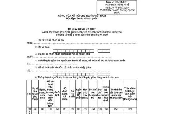 - Tờ khai đăng ký thuế theo mẫu số 20-ĐK-TCT ban hành kèm Thông tư 86/2024/TT-BTC;