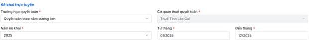 + Năm kê khai: chọn năm thực hiện quyết toán thuế TNCN; sau khi chọn, hệ thống sẽ tự động hiển thị khoảng thời gian tương ứng (từ tháng đến tháng).