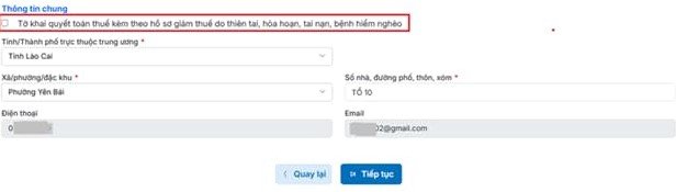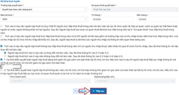 - Nhấn “Tiếp tục” để chuyển sang màn hình kê khai kế tiếp.
