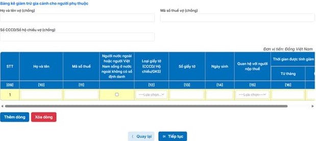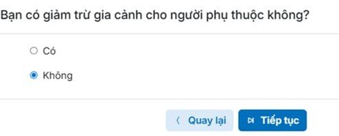 - Nếu chọn “Có”, cần kê khai chi tiết tại bảng thông tin người phụ thuộc, sau đó tiếp tục sang bước kế.