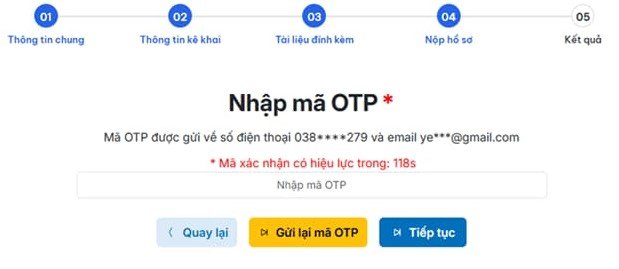 Bước 7: Hệ thống gửi mã OTP về số điện thoại và địa chỉ email NNT đã đăng ký với cơ quan thuế, NNT nhập mã OTP nhận được và chọn “Tiếp tục” để nộp tờ khai.