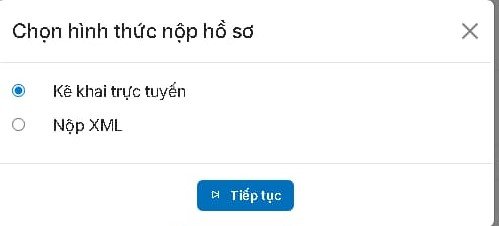 Bước 5: Người nộp thuế có thể lựa chọn hình thức nộp hồ sơ kê khai trực tuyến hoặc nộp file XML, trong trường hợp này hướng dẫn người nộp thuế kê khai trực tuyến. Người nộp thuế tích chọn “Kê khai trực tuyến” và bấm “Tiếp tục”.