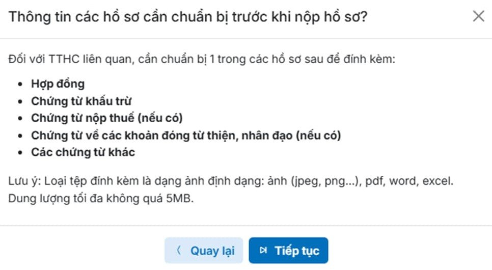 Hệ thống sẽ hiển thị các hồ sơ liên quan NNT cần chuẩn bị trước khi nộp hồ sơ, NNT chọn “Tiếp tục” để kê khai.