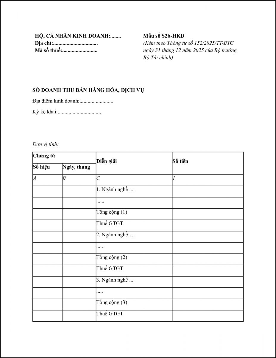 (1) Sổ doanh thu bán hàng hóa, dịch vụ (Mẫu số S2b-HKD)