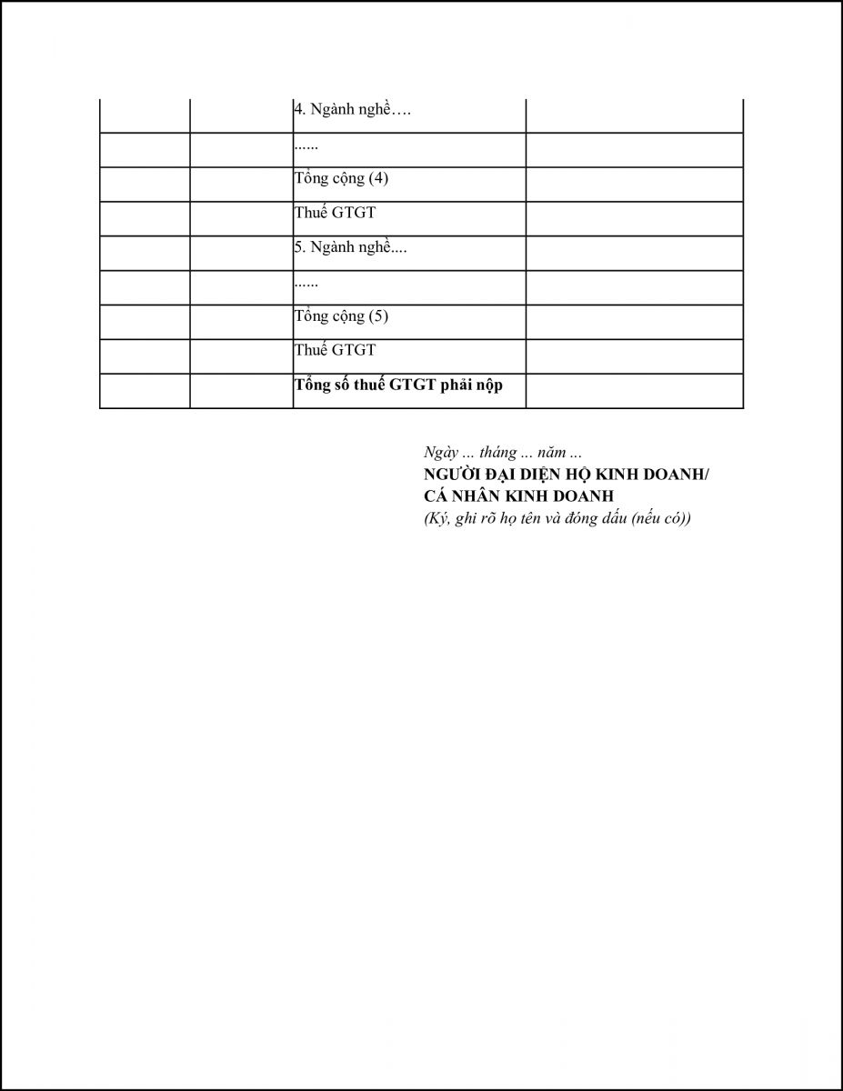 + Cột 1: Ghi số tiền bán hàng hóa, dịch vụ có thể theo từng ngành nghề để làm căn cứ xác định doanh thu bán hàng hóa, dịch vụ theo từng ngành nghề có cùng tỷ lệ % để tính thuế GTGT. Trên cơ sở doanh thu được xác định, hộ kinh doanh, cá nhân kinh doanh tính ra số tiền thuế GTGT phải nộp theo từng ngành nghề có cùng tỷ lệ % để tính thuế GTGT. Dòng cuối cùng ghi tổng số thuế GTGT phải nộp.