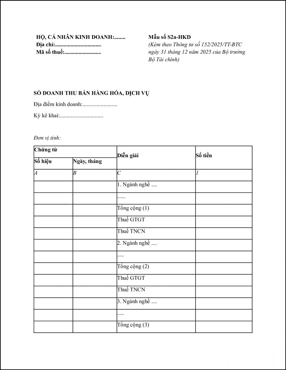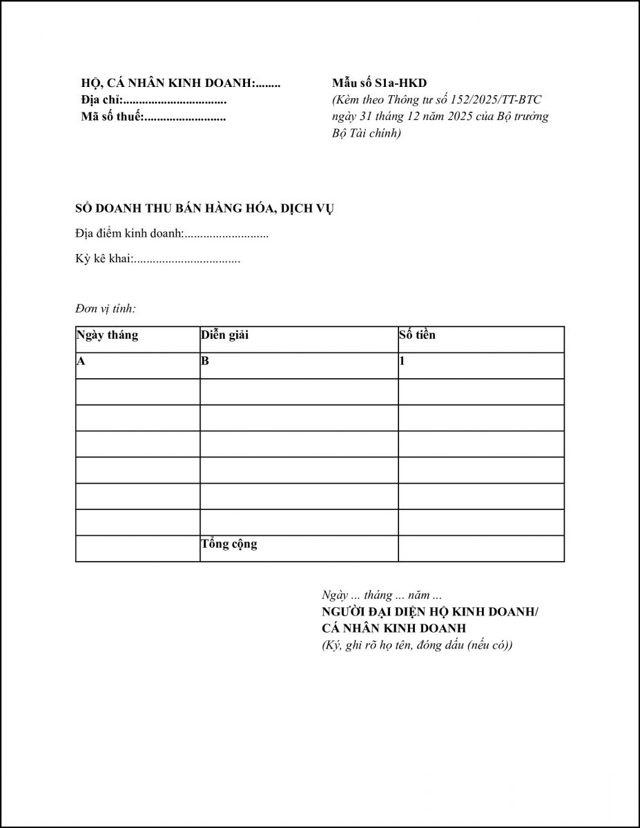 Căn cứ theo điều 4 tại thông tư 152/2025/TT-BTC hướng dẫn cá nhân, HKD sử dụng sổ doanh thu bán hàng hóa, dịch vụ theo mẫu số S1a-HKD