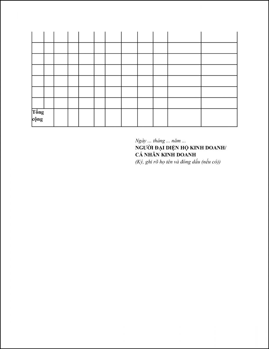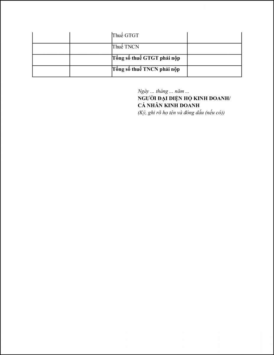 + Cột 1: Ghi số tiền bán hàng hóa, dịch vụ có thể theo từng ngành nghề để làm căn cứ xác định doanh thu bán hàng hóa, dịch vụ có cùng tỷ lệ % để tính thuế GTGT hoặc cùng mức thuế suất để tính thuế TNCN. Trên cơ sở doanh thu được xác định, hộ kinh doanh, cá nhân kinh doanh tính ra số tiền thuế GTGT, thuế TNCN phải nộp theo từng ngành nghề có cùng tỷ lệ % hoặc cùng mức thuế suất. Dòng cuối cùng ghi tổng số thuế GTGT, thuế TNCN phải nộp.