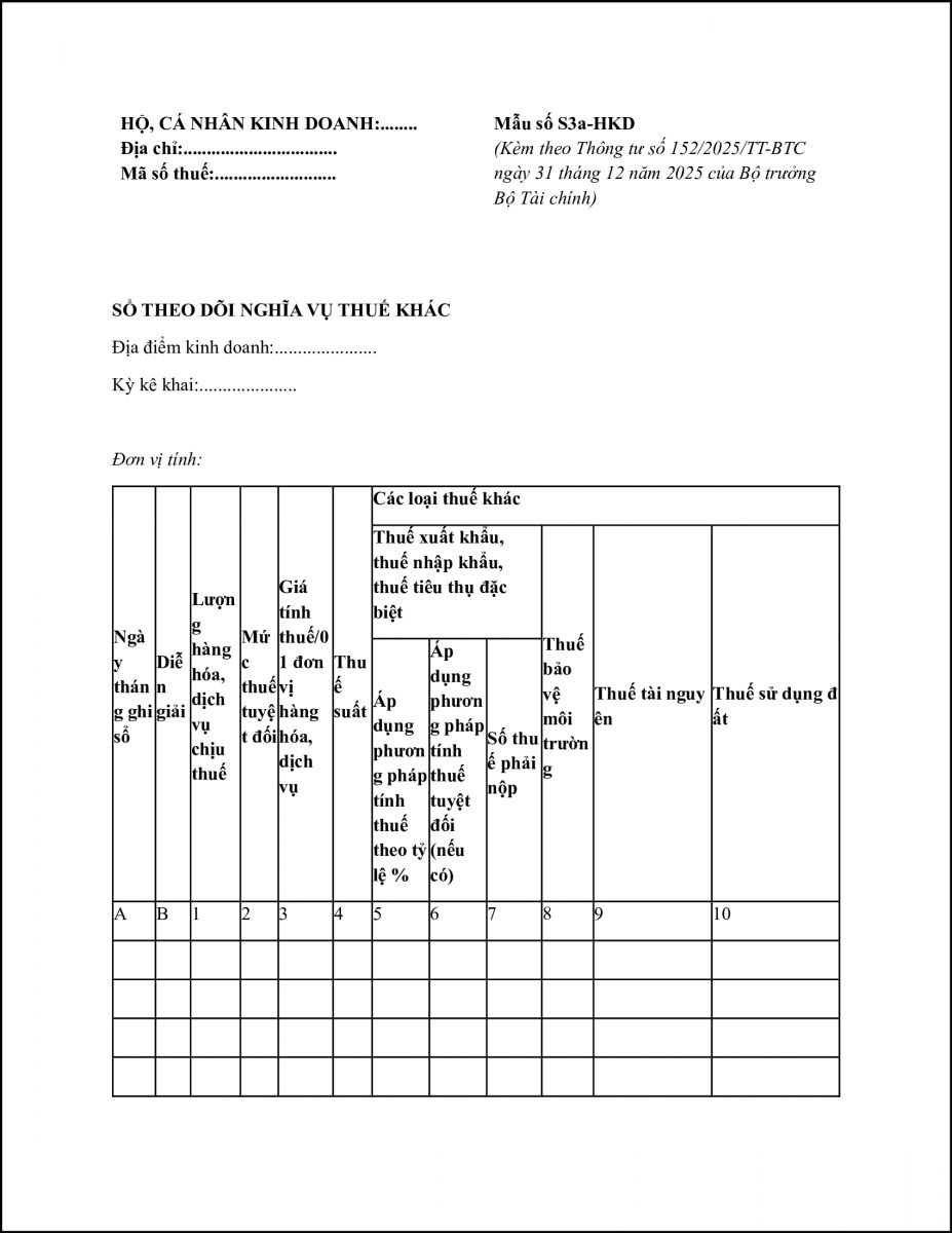 Đối hộ kinh doanh, cá nhân kinh doanh có hoạt động thuộc diện chịu các loại thuế khác (thuế xuất khẩu, thuế nhập khẩu, thuế tiêu thụ đặc biệt, thuế tài nguyên, thuế bảo vệ môi trường, thuế sử dụng đất) thì sử dụng thêm sổ theo dõi nghĩa vụ thuế khác (Mẫu số S3a-HKD)