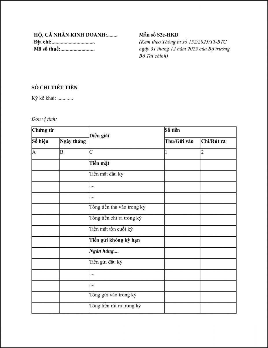 (4) Sổ chi tiết tiền (Mẫu số S2e-HKD)