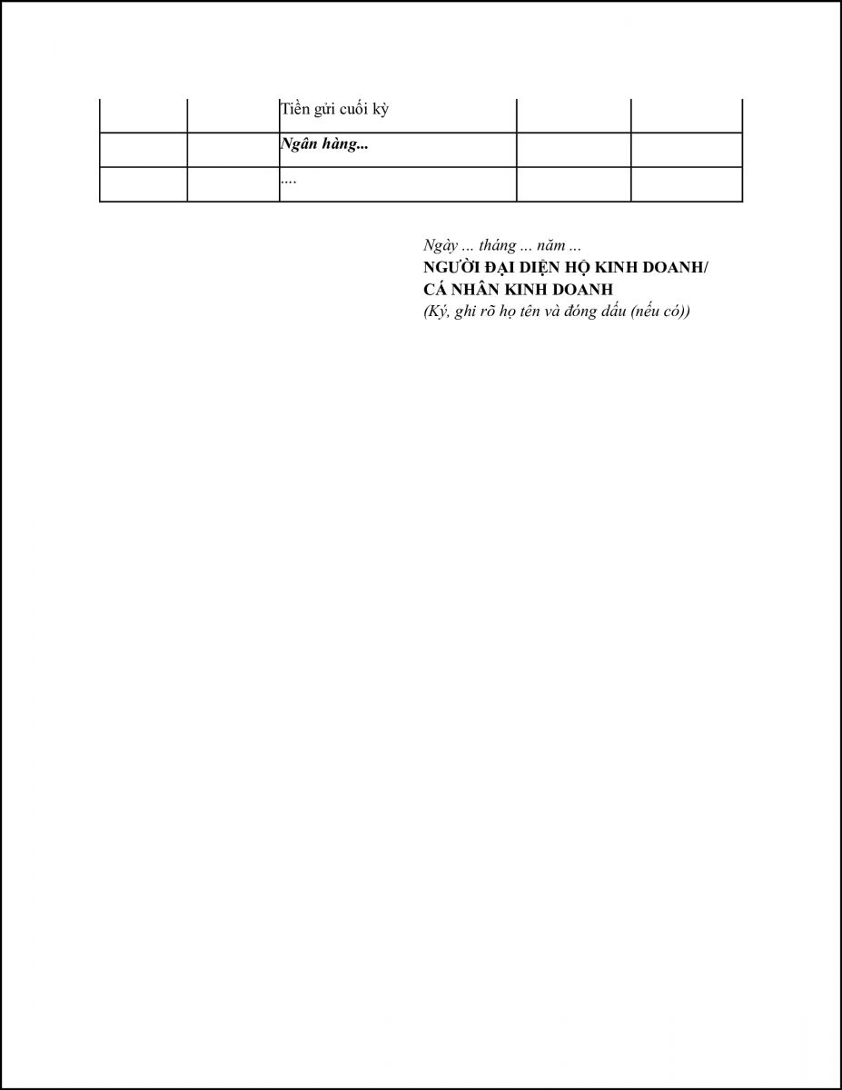 Cuối kỳ, hộ kinh doanh, cá nhân kinh doanh tính ra số tiền mặt thu, chi, tồn quỹ và số tiền gửi không kỳ hạn gửi vào, rút ra, dư cuối kỳ.