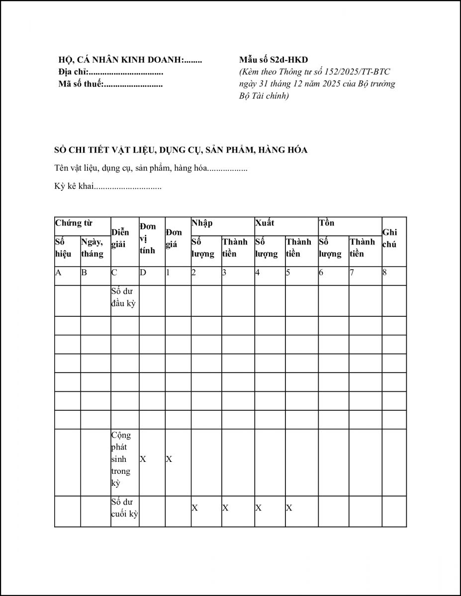 (3) Sổ chi tiết vật liệu, dụng cụ, sản phẩm, hàng hóa (Mẫu số S2d-HKD)