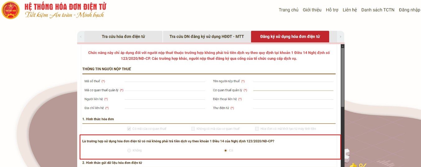 Bước 3: Nếu chọn HĐĐT có mã, tích lựa chọn có/không trả tiền dịch vụ (theo diện được hỗ trợ)
