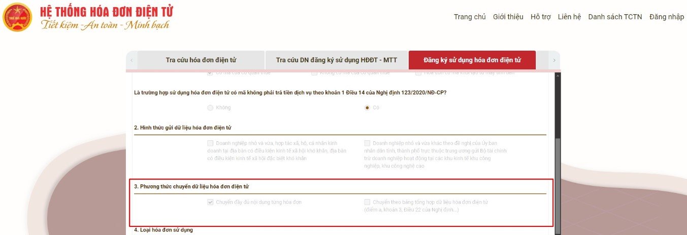 Bước 4: Chọn phương thức chuyển dữ liệu hóa đơn điện tử (theo nhóm hóa đơn/chứng từ sử dụng)