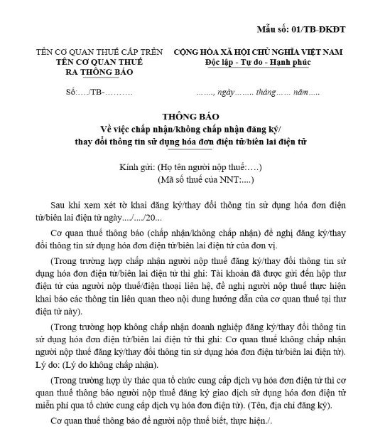 + Chấp nhận đăng ký sử dụng hóa đơn điện tử